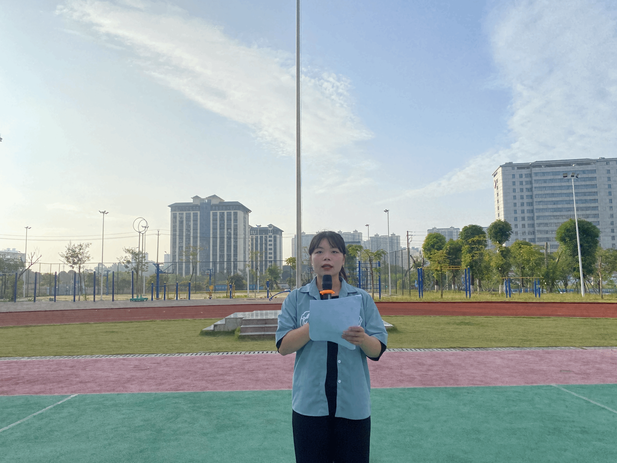 升国旗仪式后,数字艺术与传媒学院党总支书记麦旭讲授了题为《以青春之名,向祖国献礼》的思政课。麦旭勉励青年学子应该铭记历史,珍惜当下,更要展望未来,肩负起实现中华民族伟大复兴的历史使命,学好专业知识,让自己成为国家和社会的有用之才。