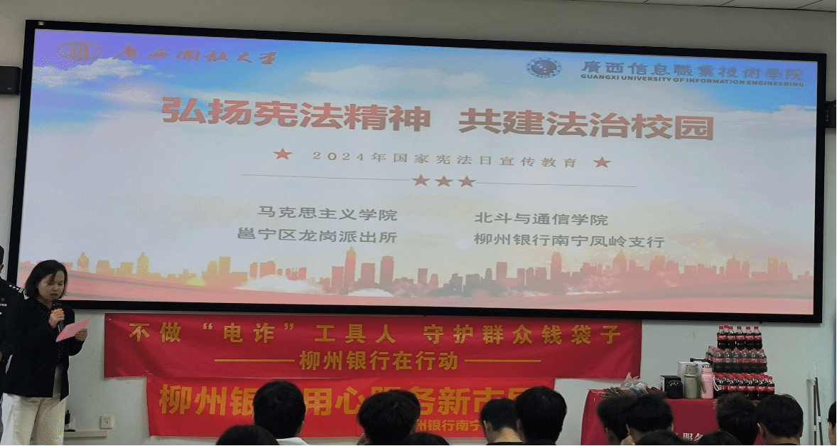 马克思主义学院 蒋婕报道 12月4日,恰逢第11个国家宪法日,pg娱乐马克思主义学院携手南宁市公安局龙岗派出所和柳州银行南宁凤岭支行,成功举办了“弘扬宪法精神 共建法治校园”主题宣传教育活动。学校北斗与通信学院(智能制造学院)150余名学生参与活动。