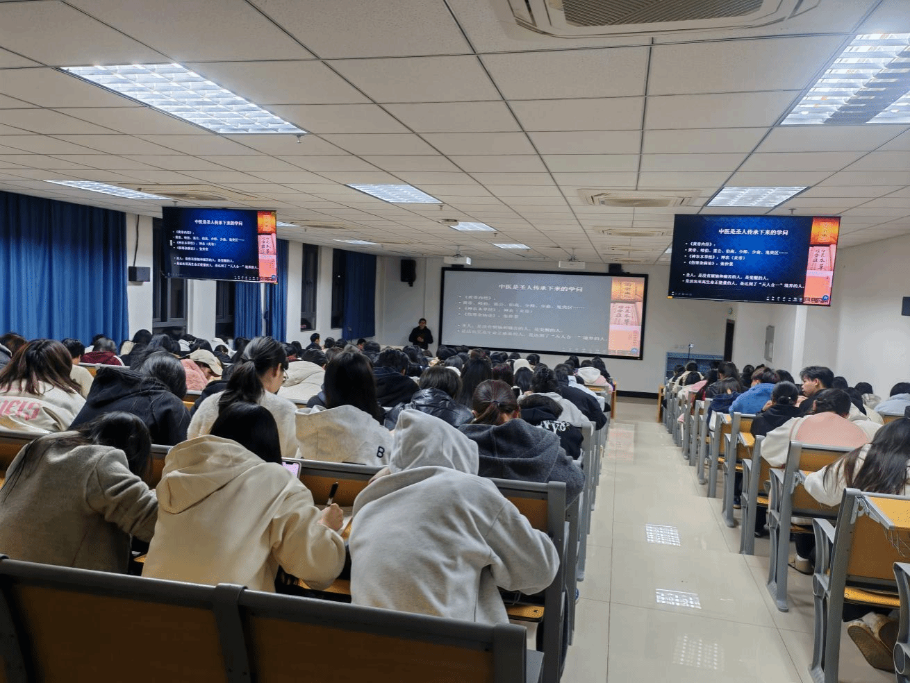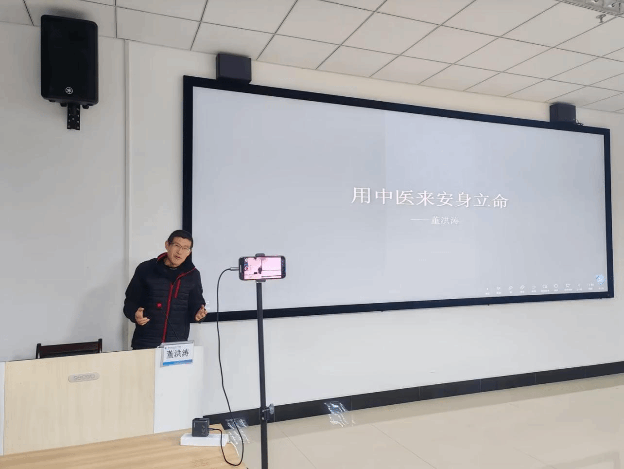 董洪涛长期从事中医药临床理论和实践研究,擅长应用中医疗法治疗各种急症、重症、疑难杂症。讲座中,董博士从中医发展、中医文化、健康观念、防病之道以及治未病思想等方面对中医理念和健康管理科普知识进行了分析讲解,重点围绕中医核心理论,深入阐释阴阳平衡之道,分享了中医人价值观与人生感悟,将中医智慧融入现代健康管理和生活方式,鼓励同学们要热爱专业、热爱中医、关爱健康,讲座内容通俗实用,形式生动活泼,使在场师生在学习中感受中医药文化的魅力。