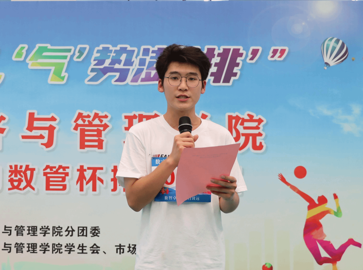 顾玉俊鼓励同学们以球会友,展现数管风采;全员参与,凝聚班级力量;公平竞技,彰显赛事魅力;同时强调安全保障,确保比赛顺利进行,并正式宣布本次气排球比赛开幕。