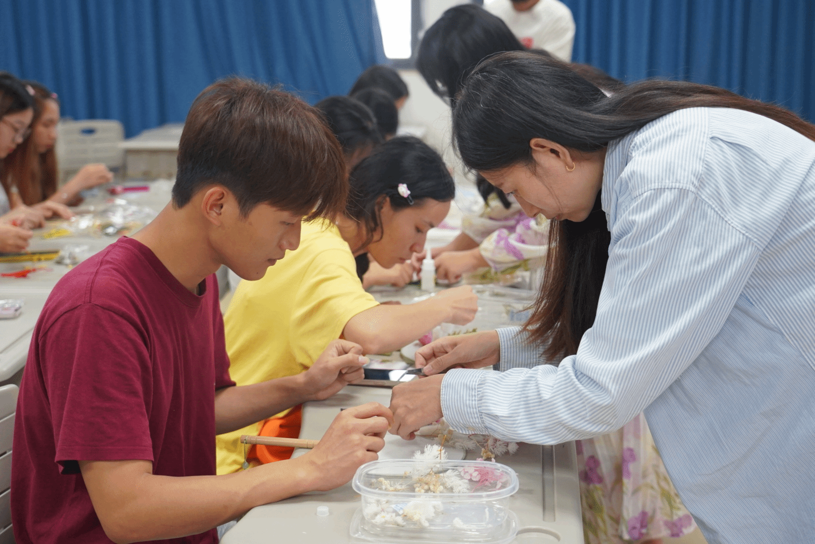 在手工制作环节,指导老师带领同学们制作艾草香包、永生花干团扇、创意竹编风铃挂件等特色工艺品,鼓励同学们要坚守匠心、大胆尝试。同学们轻挑慢缝,剪裁粘贴,精益求精享受手作的乐趣,获得轻松快乐的体验。