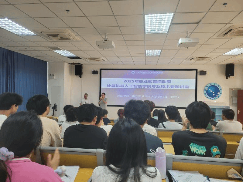 计算机与人工智能学院 刘明权 报道 2025年职业教育活动周期间,计算机与人工智能学院邀请南宁职业技术大学教授高伟锋主讲,成功举办人工智能技术专题讲座,计算机与人工智能学院2023级、2024级学生聆听了讲座。