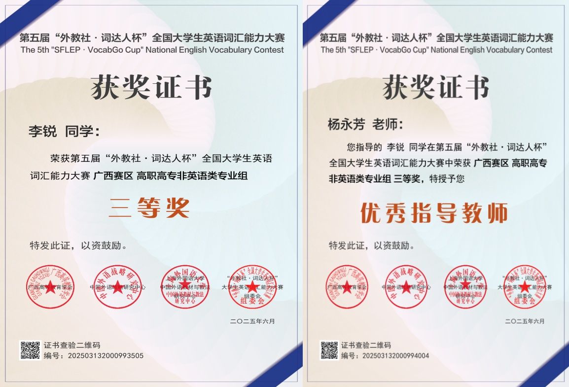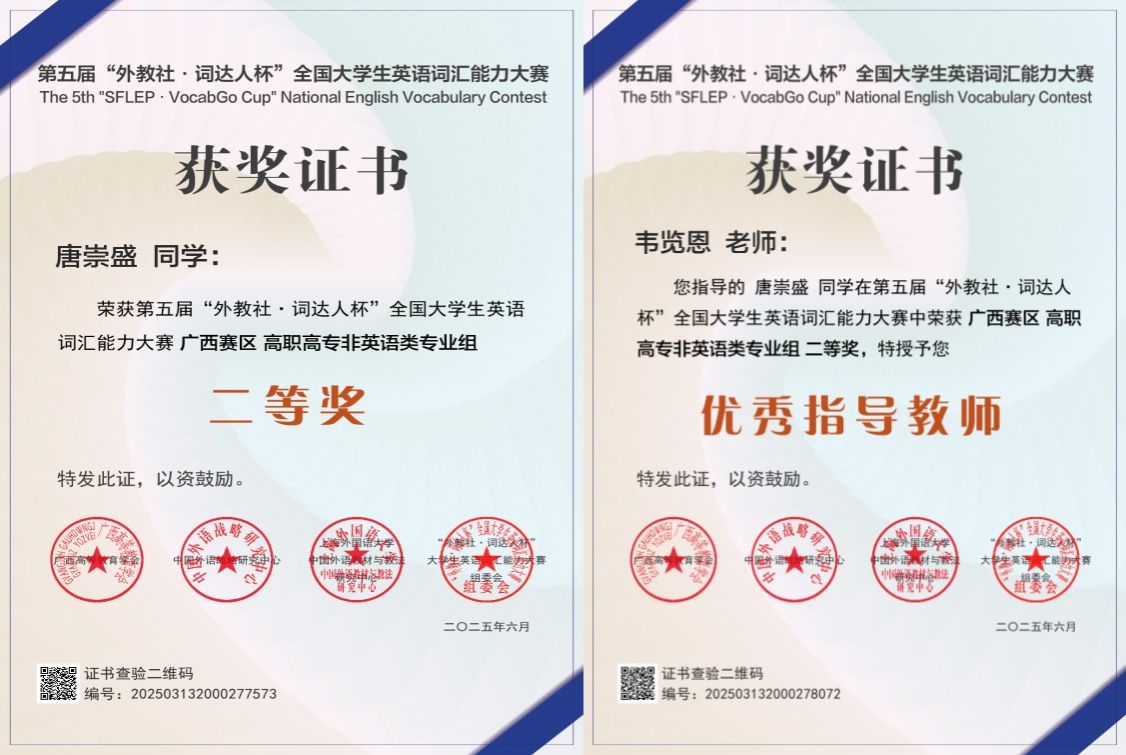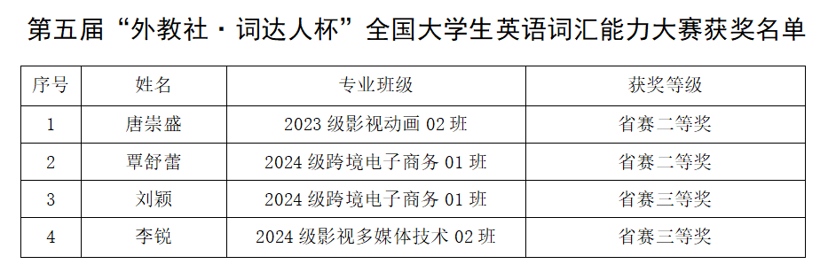 通识教育学院 冯颖 报道 近日,第五届“外教社·词达人杯”全国大学生英语词汇能力大赛落下帷幕。pg娱乐4名学生在高职高专非英语类专业组荣获佳绩,2人获省赛二等奖、2人获省赛三等奖。