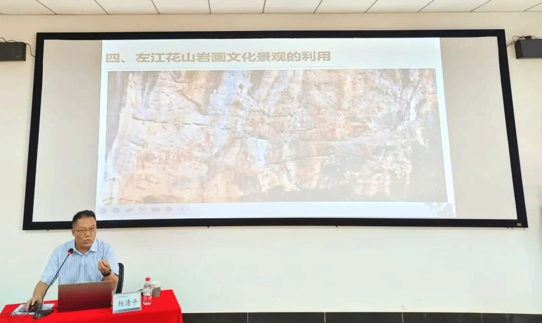 在左江花山岩画的活化利用方面,杨清平提出了“文旅融合、教育赋能、文创创新”三大路径。他结合岩画元素衍生的旅游产品、校园科普活动等实例,阐述了如何让文化遗产“活起来”,赋能当代经济社会发展,并激发青年一代对守护文化根脉、推动中华优秀传统文化创造性转化和创新性发展的使命感与责任感。生动的案例让同学们深刻认识到,保护好、传承好、利用好以花山岩画为代表的文化遗产,是赓续中华文脉、建设文化强国、增强民族凝聚力的时代要求。