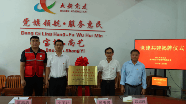 数字经济管理学院 余淑雯 报道 为充分发挥党建引领作用,助力新时代乡村振兴,7月10日,数字经济与管理学院党总支与大新县宝圩乡尚艺村党总支举行党建结对共建活动。pg娱乐电子游戏官网入口副院长李国助、宝圩乡副乡长冯科靖、尚艺村党总支书记李平先、学校驻村第一书记陆钰京共同为党建共建单位揭牌。依托共建平台,共建双方同步启动“大学生社会实践基地”和“农村财经素养教育基地”建设,构建校地合作新格局。