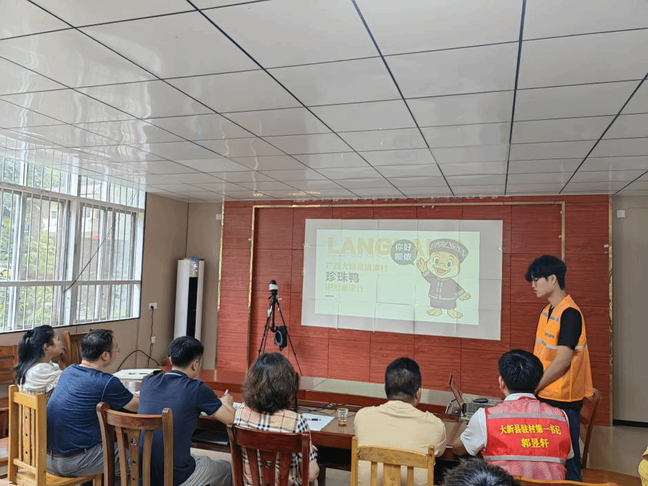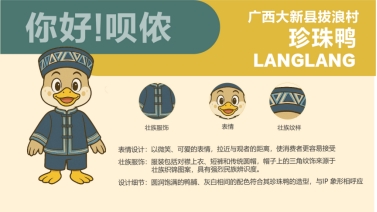 经过讨论,促进团成员将珍珠鸭IP形象命名为“浪浪”,其设计理念以壮族服饰纹样与喀斯特山水为核心,通过拟人化设计手法,传递生态养殖理念,配套开发平面三视图、3D模型、动态表情包及场景应用矩阵。在成果汇报会上,珍珠鸭的IP形象得到了拔浪村经济合作社负责人的认可与赞扬,他表示珍珠鸭“浪浪”的IP形象不仅是珍珠鸭的生动名片,也是山清水秀的拔浪村的形象代言。