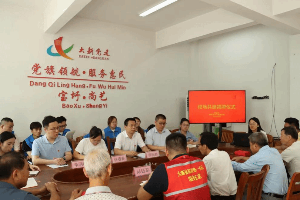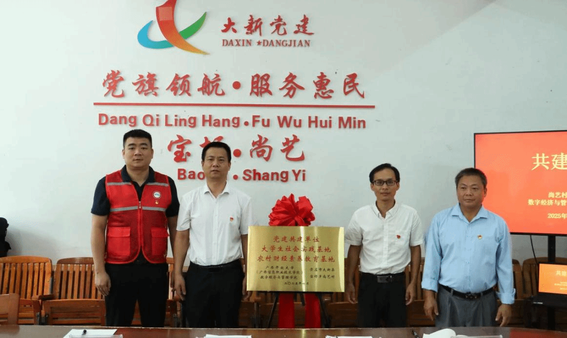 pg娱乐电子游戏官网入口数字经济与管理学院与大新县宝圩乡尚艺村举行校地结对共建活动,pg娱乐电子游戏官网入口副院长、数字经济与管理学院党总支书记、院长李国助,宝圩乡副乡长冯科靖,尚艺村党总支书记李平先,学校驻村第一书记陆钰京共同为校地共建单位揭牌,同步启动“大学生社会实践基地”建设。座谈会上,双方共商长效机制,明确以党建为引领、党建带团建,发挥学院专业优势,聚焦乡村振兴、乡村文化传承等方面精准发力,辐射乡镇周边地区,推动校地协同发展。