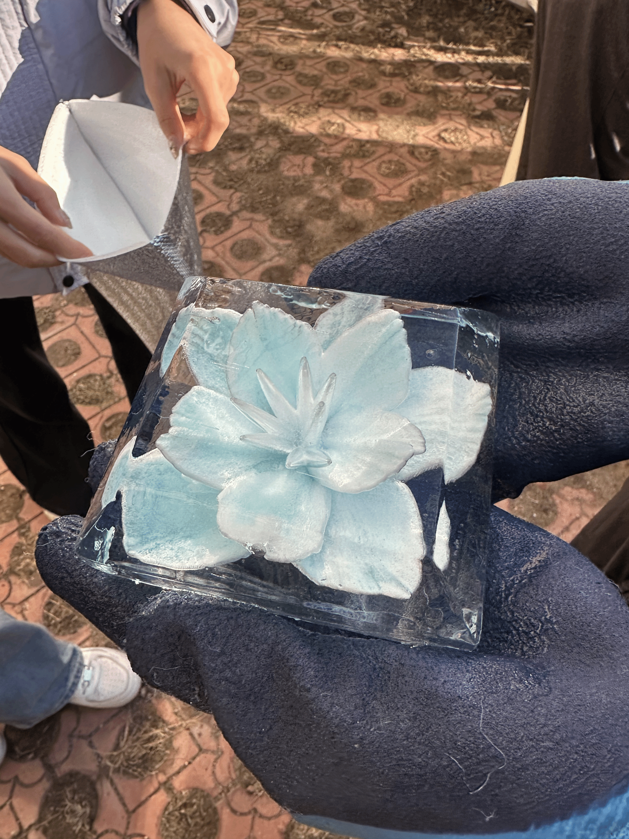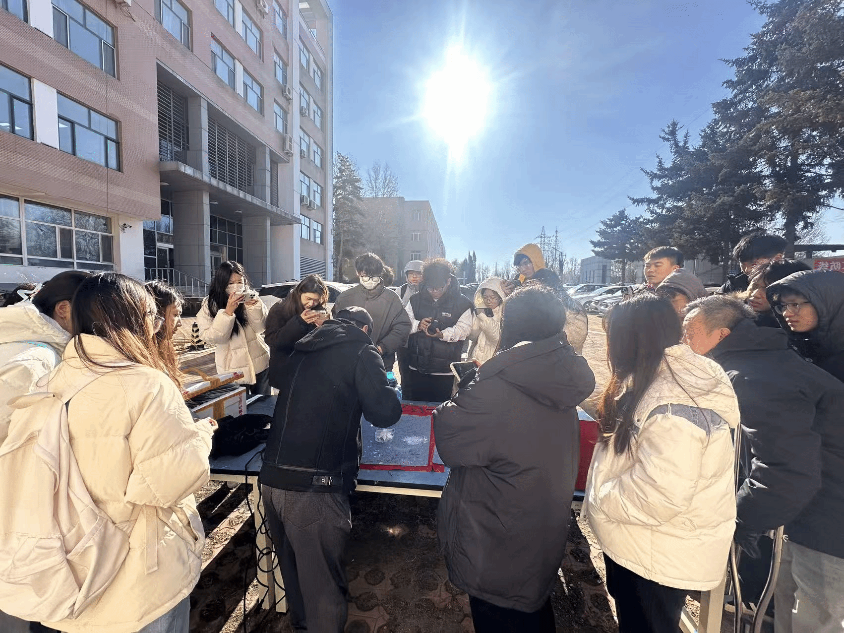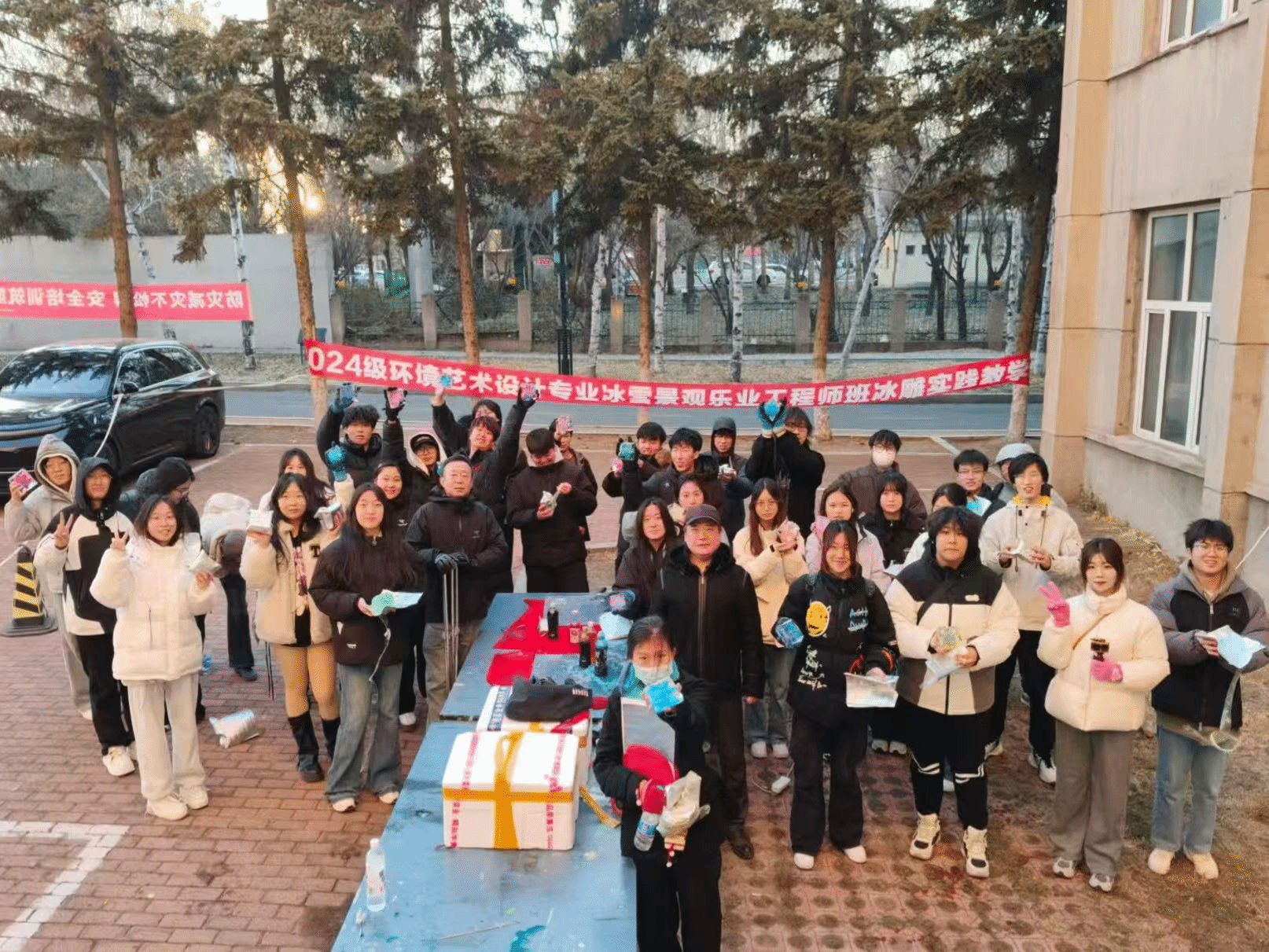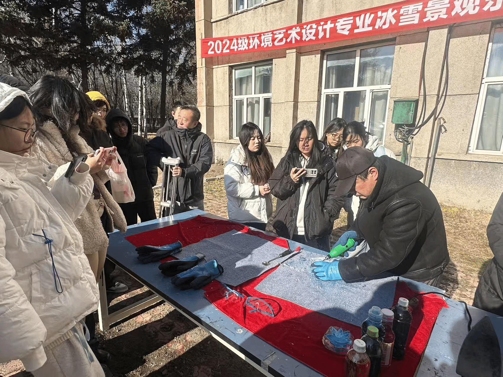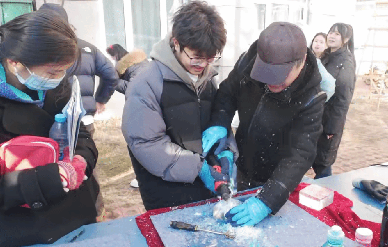 在随后的自主练习环节,大家手持工具,化身为严谨的“冰雪匠人”,迫不及待地将理论付诸实践,户外课堂充满了专注与热忱的氛围。同学们或互相交流刀法心得,或围着老师请教如何化解冰材易裂的难题,在不断的尝试与调整中,一块块朴素的方冰初现花瓣、叶脉的雏形。