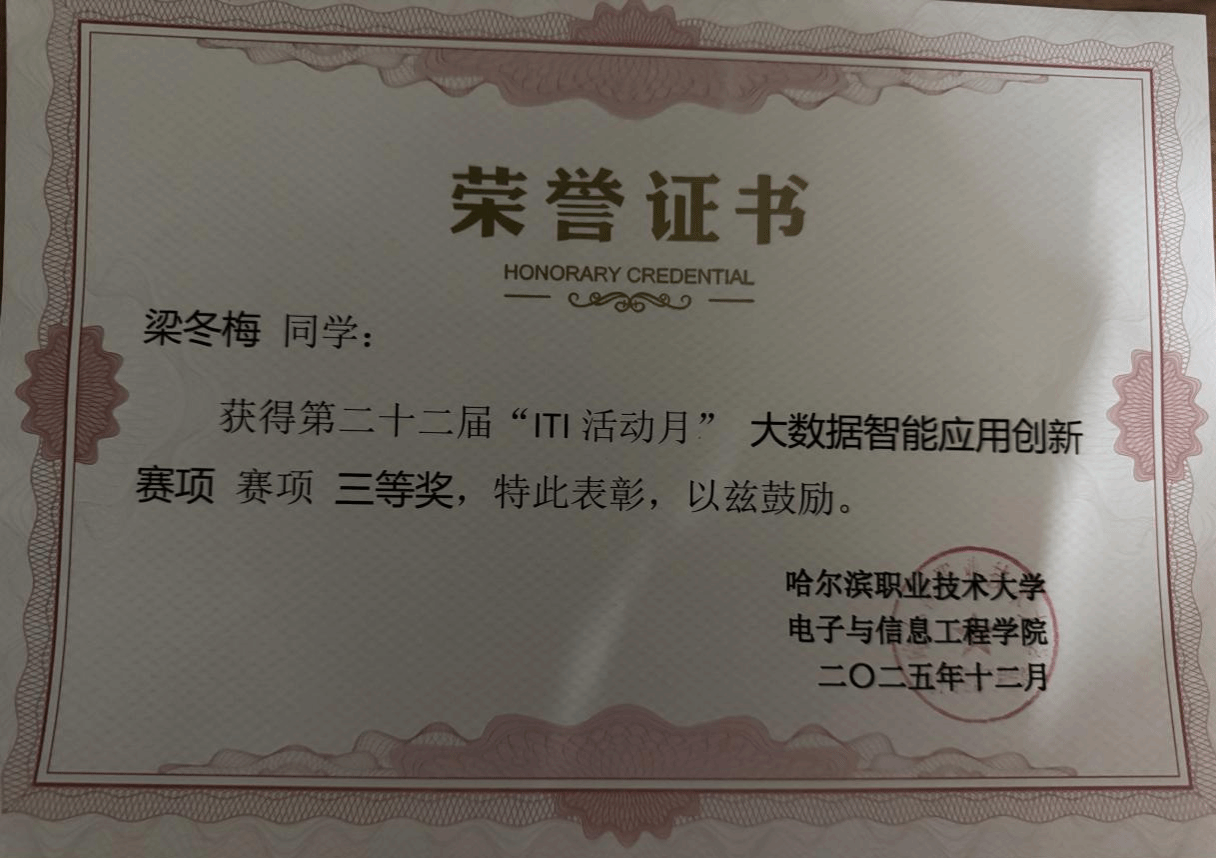 梁冬梅在哈尔滨职业技术大学电子与信息工程学院第二十二届“ITI活动月”大数据智能应用创新赛项中,围绕数据分析与智能应用展开实践,荣获三等奖。