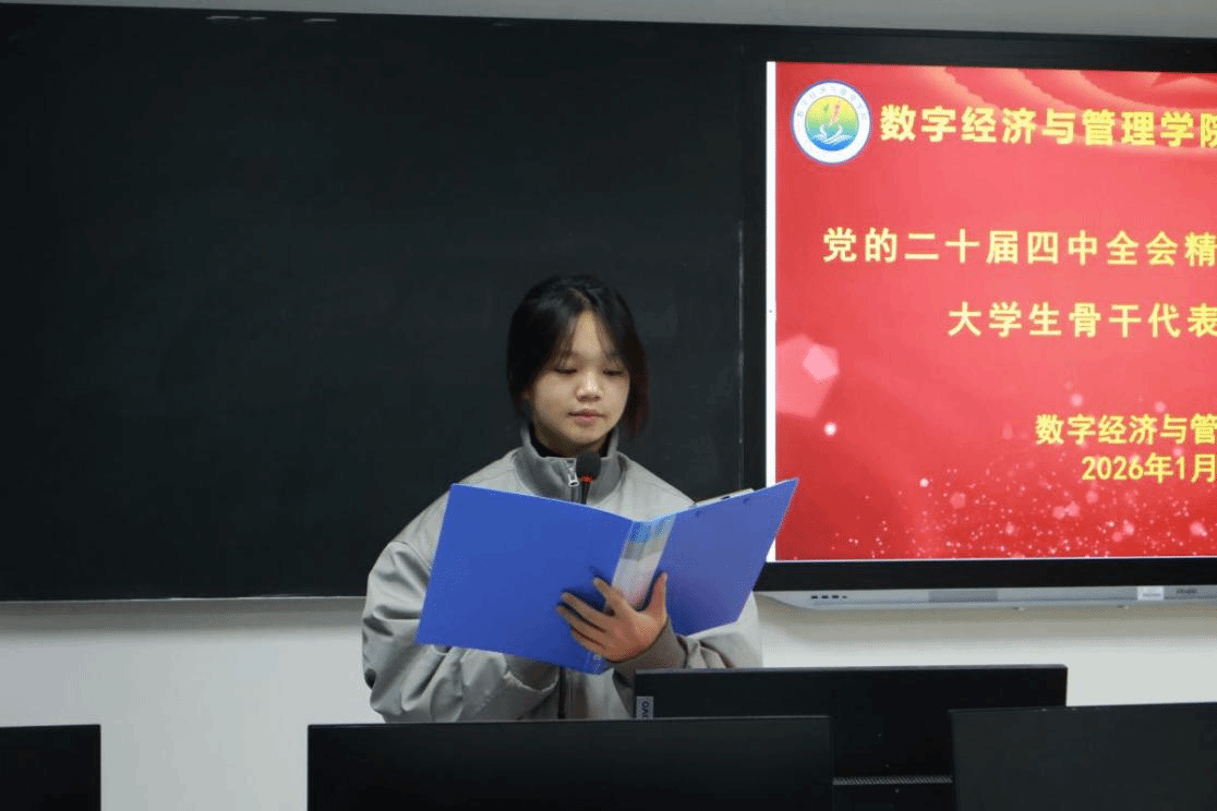 “00后”大学生骨干代表王英姿结合党的二十届四中全会精神,从坚定理想信念、校园躬行践行、寒假实践赋能、青年率先垂范四个维度作宣讲。