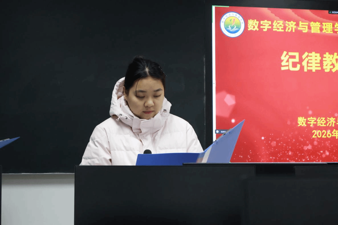 数字经济与管理学院 谢姗姗 报道 1月5日,数字经济与管理学院组织全院师生在室内开展升旗仪式,学院党总支副书记顾玉俊讲授国旗下的思政课,2025级大数据与会计2班文艺委员黄小婷担任主持。