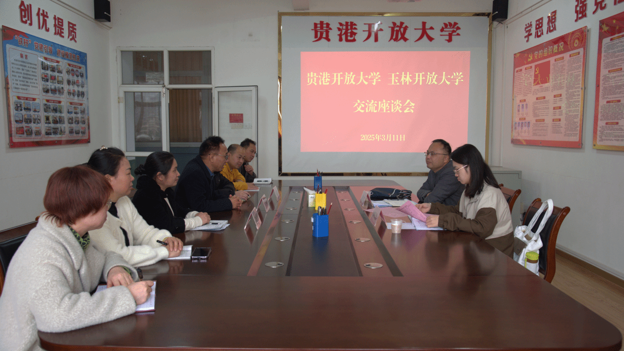 贵港开放大学 姚黎明 报道3月11日上午,玉林职业技术学院(玉林开放大学)党政办主任罗文艺一行2人到贵港开放大学开展调研交流。贵港开放大学党组书记、校长管升起,学生处处长姚黎明及学生处相关业务人员参加座谈交流。