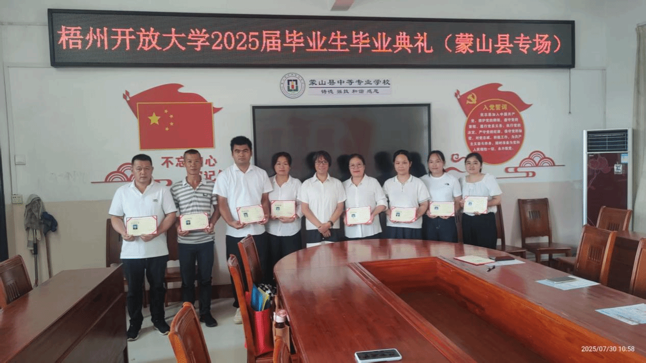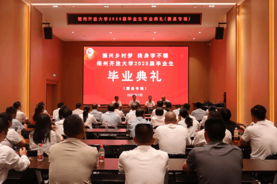 梧州开放大学 黎文华 报道 “作为开放大学的学子,我们中有在职人员、有家庭主妇、有退伍军人,每个人都在工作与家庭的夹缝中挤出时间坚持完成学业,正是这份坚持,让我们收获了丰富的知识和强大的内心。”来自23春开放教育行政管理本科班的胡庆华同学在毕业典礼上拿着毕业证书激动地说道。7月23日至30日,梧州开放大学相继在岑溪市、藤县、校本部(含辅警专场)、蒙山县举行了五场2025届毕业生毕业典礼,梧州开放大学开放教育本科班、单考单招专科班、村“两委”中专班共387名毕业生顺利拿到了毕业证书。