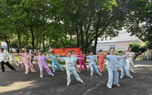 八段锦作为源远流长的中华传统养生功法,以其动作柔和、简单易学、兼具修身养性的特点,成为社区推广科学健身的理想形式。活动现场,参与者统一身着练功服,在杨氏太极拳第七代传人,中国武术四段、一级辅导员刘玉英教练的带领下,从起势“两手托天理三焦”到收势“背后七颠百病消”,认真揣摩每一式要领。教练不仅进行动作示范,还细致讲解呼吸配合与肢体舒展的关键细节,耐心纠正学员动作,确保大家准确掌握功法精髓。
