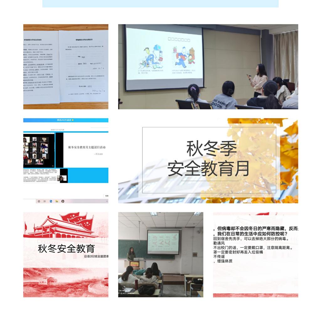 为切实做好秋冬季安全教育工作,11月6日,召开秋冬季安全教育月主题教育,针对秋冬季疫情防控、传染病防治、宿舍用电安全等方面进行宣传教育,全方位为学生解读《beat365英国官方网站安全告知书》,引导学生增强安全责任意识,增强自我防护能力。学院各团支部积极响应号召,召开线上线下主题团日,向学生宣传普及疫情防控知识,引导学生将疫情防控安全责任内化于心,外化于行,激发学生责任担当。