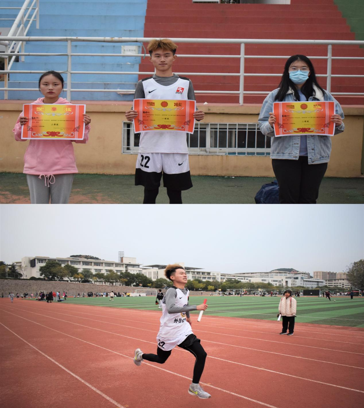 在精彩的4×100m的接力比赛中,外院学子团结一心,奋勇争先,最终韩语211班、英语211班、英语214班分获冠、亚、季军。