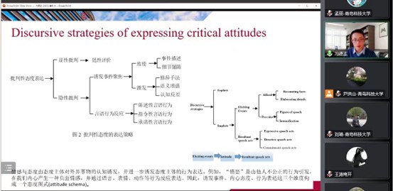冯德正博士首先介绍了多模态中国话语体系,包括国际传播话语体系和多模态话语治理体系,并提出建构并深入研究多模态中国话语治理体系对提高社会治理水平,增强国家软实力,提升中国形象具有积极意义,是新时代话语分析学者的重要任务。之后,冯博士强调了话语分析框架的重要性,借助话语分析框架可以系统连接宏观与微观、抽象与具体。另外,冯博士从国际传播话语和超文化形象建构等视角,结合数字公共外交、西安城市形象建构、冬奥会开幕式等具体案例,分别对其话语分析框架进行了详细介绍。报告还指出,研究融汇中外、贯通古今的超文化身份,是构建新时代多模态中国话语体系的一个重要部分,政府、外交官、学者等都有责任去构建多主体、全方位、立体化的多模态中国话语体系。最后,冯德正博士与在线师生进行了积极互动,解答了大家在多模态研究分析方法、理论和内容等方面的困惑,使在线师生获益匪浅。
