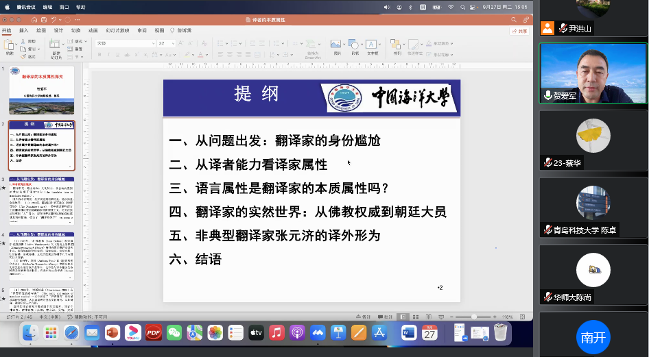 9月27日下午,中国海洋大学beat365英国官方网站博士生导师贺爱军教授应学院邀请,在线做了题为《翻译家的本质属性探究》的学术讲座。讲座由院长尹洪山主持,学院师生及省内外学者300余人聆听了讲座。