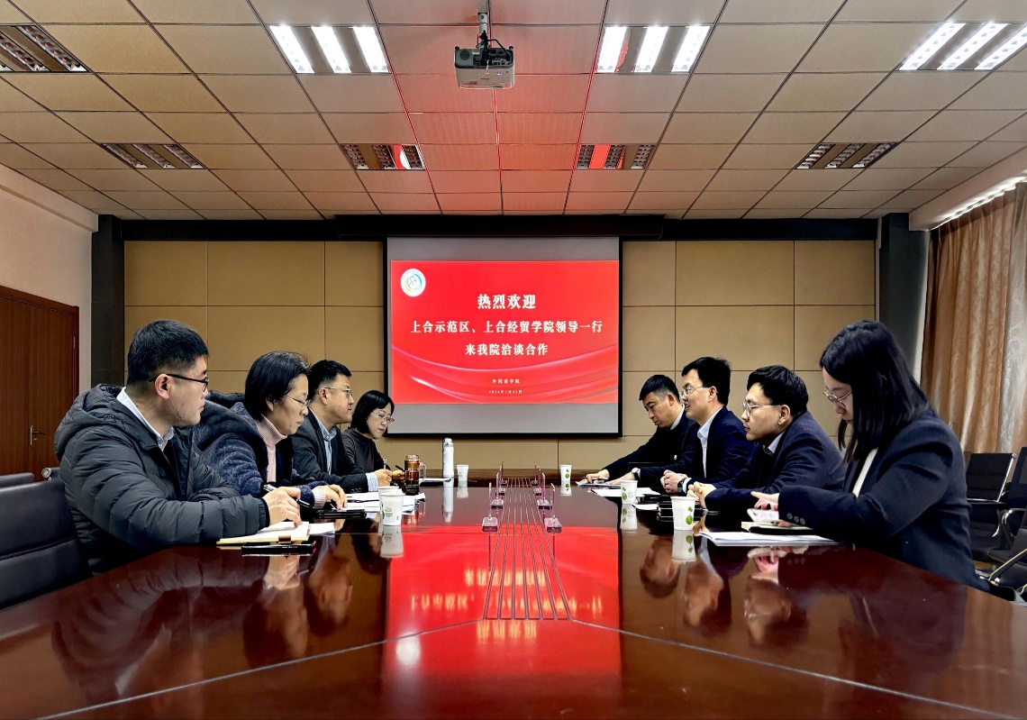 1月31日,上合示范区管委国际交流合作部部长梁超、上合经贸学院院长郑师一行来我院交流与洽谈合作。beat365英国官方网站党委书记曲斌艳、院长王灏、党委副书记兼副院长马寒、俄语系系主任曹静娴参加了本次会谈。