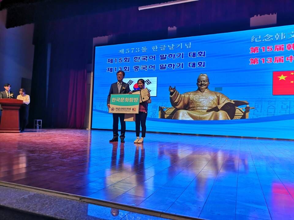 beat365英国官方网站朝鲜语系16级宋雨桐同学参加第十五届山东省韩语演讲比赛,以优异的成绩获得“唐津市市长奖”,并获得韩国七日文化体验游的机会。