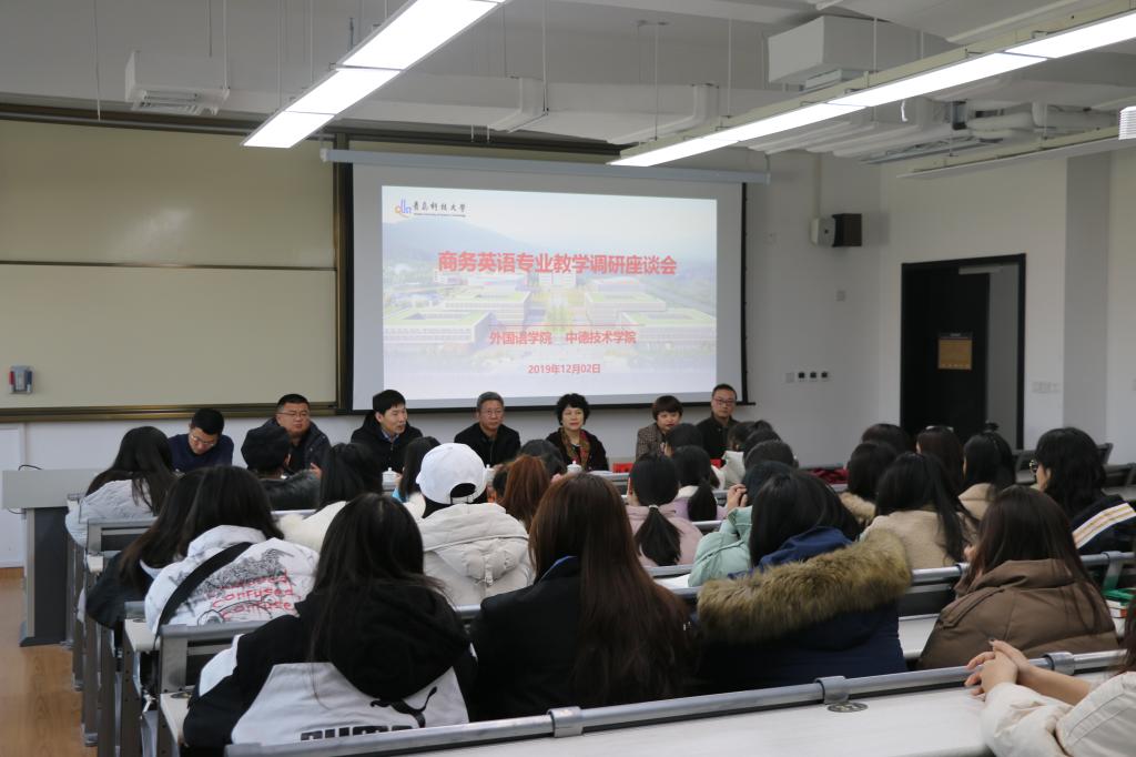 三、师生座谈,解决学生实际问题。beat365英国官方网站领导班子与中德校区四个班的同学进行了座谈,并就外语专业的前景、学习方向、就业方向进行了介绍和指导,旨在解决学生学习生活中的问题,破解职业生涯规划难题。