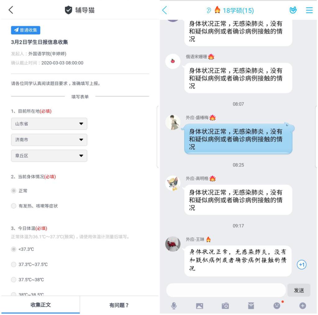 准确掌握信息是有效防控疫情的重要前提。自疫情暴发至今,学院建立起“院领导—系部主任—教师”三级联络教工体系和“副书记—辅导员—学生骨干—普通同学”四级联络学生体系,确保信息日报工作覆盖全面、及时上报。实行疫情日报制度,通过“今日校园”app和QQ群健康打卡制度,不断更新每个师生的具体情况,掌握师生每天所在地、身体状况、计划返校时间等情况。通过全覆盖、无死角的“地毯式”摸排,确保全面排查师生情况,提高了信息报送及时性与精准度。