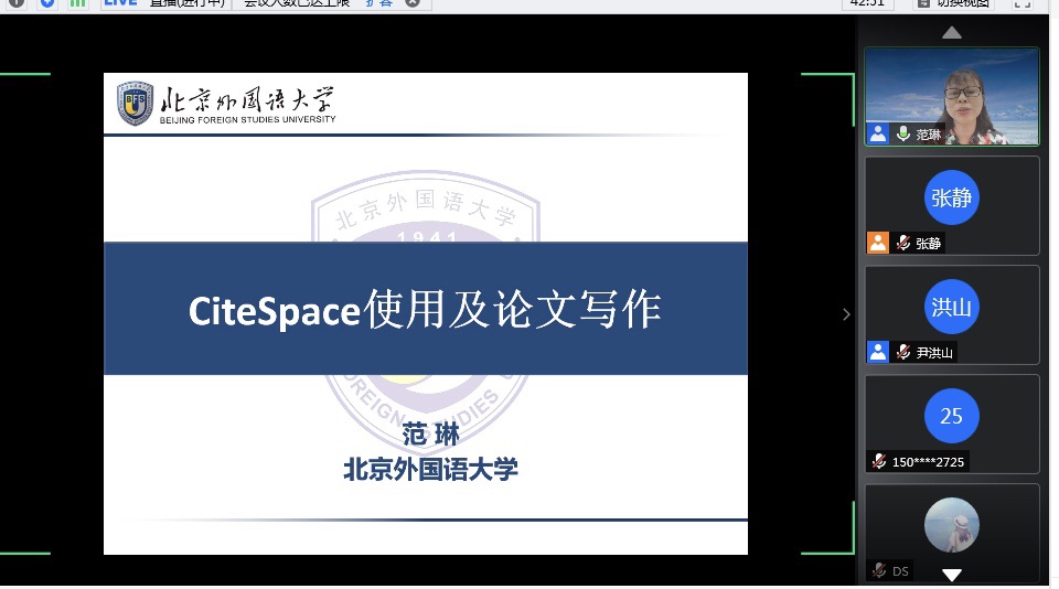 7月7日下午,北京外国语大学博士生导师范琳教授应邀为广大师生做了题为《Citespace使用及论文写作》的线上学术讲座。讲座由beat365英国官方网站院长尹洪山教授主持,beat365英国官方网站部分教师和研究生在线聆听了讲座。此外,讲座还吸引了山东大学、中国海洋大学、北京外国语大学、南京农业大学、山东科技大学、曲阜师范大学等高校的1300多名师生参与。