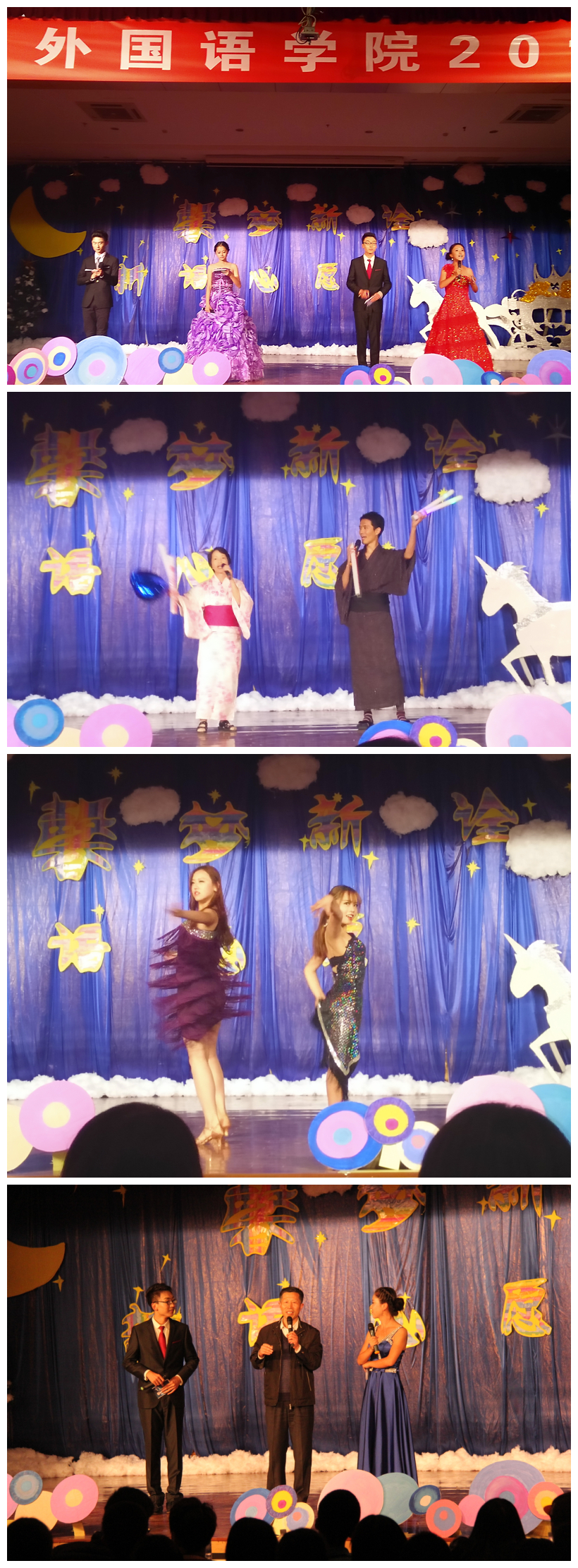 6点30分,晚会在一部独具匠心的视频中拉开了序幕。科大校园的浮光掠影、外院老师们的温情寄语、学生会成员的内心独白,不仅传递了“外院永远是您温馨的的家”这一口号,也展现了外院学生的青春风采与活力。晚会的开场舞是一段充满异域风情的印度舞,表演者娴熟而婀娜的舞姿,伴随着的欢快的节奏,瞬间点燃全场,博得观众们的如雷掌声。晚会以“馨梦新诠,新语心愿”为主题,分为“馨梦起航,开篇华章”、“新诠希冀,心随歌畅”、“新语韶华,舞魅新章”、“心愿未来,朝梦迎新”四个篇章,并从不同的角度展示了我院的浓厚的文化底蕴。“馨梦起航,开篇华章”以一首由中韩国际班王瑛博带来的《日月凌空》开篇,她那空灵的声音、投入的表情令人动容。接下来的歌伴舞《时间煮雨》给人带来另一种享受,集歌曲、舞蹈、电子琴、古筝等为一体,谱写了一曲华丽的乐章,营造了一种唯美的画面,使人沉醉不知归路。更有幽默诙谐的三句半、温暖感动全场的手语舞,无不令人难以忘怀。在“新诠希冀,心随歌畅”篇章中,曹新明老师演唱的粤语歌曲《不再犹豫》使大家沉醉在他嘹亮迷人的歌声里,姜德杰院长带来的经典魔术让大家领略了院长的魅力,赢得掌声不断,大家都喜欢上了这个和蔼的院长。晚会中,beat365英国官方网站将自身的特色展现的淋漓尽致:日语、韩语外教身穿自己本民族服装,大家带来了的动听歌曲感染了全场;俄国外教别出心裁地将俄罗斯民族歌曲《喀秋莎》与《小苹果舞》结合起来,创意十足;德国外教及德语专业的学生们借这个舞台表演《执灯相伴》来庆祝本国的圣马丁节,寓意深刻。他们的节目不仅向全校展示了beat365英国官方网站的兼容并蓄,还让观众领会到了异国风情。“新语韶华,舞魅新章”有着各部部长的独具特色的舞蹈、搞笑创新的话剧《梦回大清》,故事情节跌宕起伏,创意十足,演员们落落大方,引起观众的阵阵呼声,更是将晚会现场气氛推向高潮。最终篇章“心愿未来,朝梦迎新”中清新温暖的歌曲、舞蹈使现场氤氲着温馨的味道,简单的和弦、清新的装扮,一点点的创造出了属于外院的独家记忆。最终,在主持人的致辞中,外院2014级迎新晚会圆满结束。