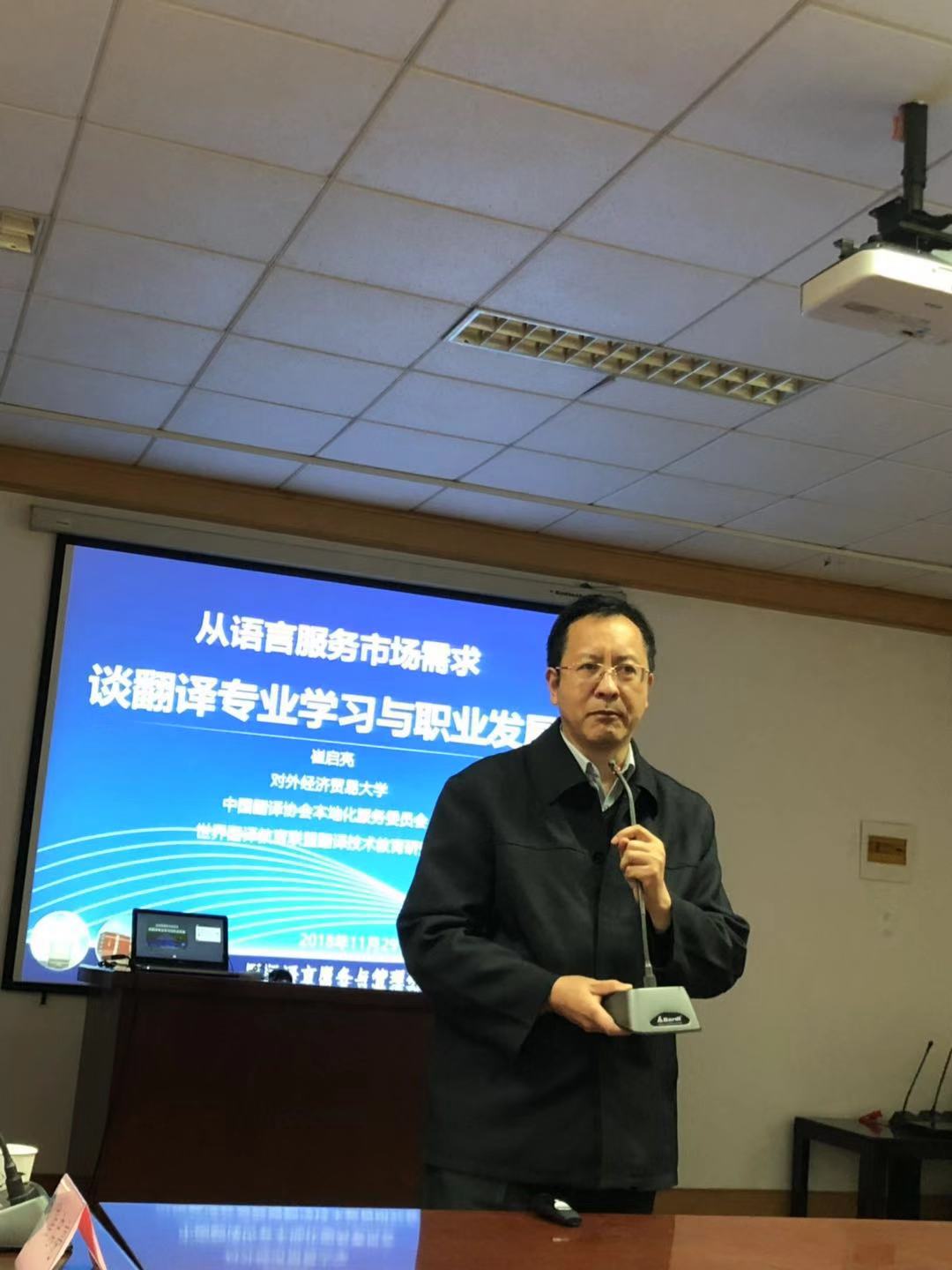 11月29日下午3:30,外经贸大学硕士研究生导师崔启亮应邀来我院进行学术交流,在经管学院313会议室为大家带来一场题为“从语言服务市场需求谈翻译专业学习与职业发展”的精彩报告。报告由吕耀中副院长主持,院长尹洪山、MTI中心主任房钰及部分翻译硕士师生参加了此次讲座及交流。