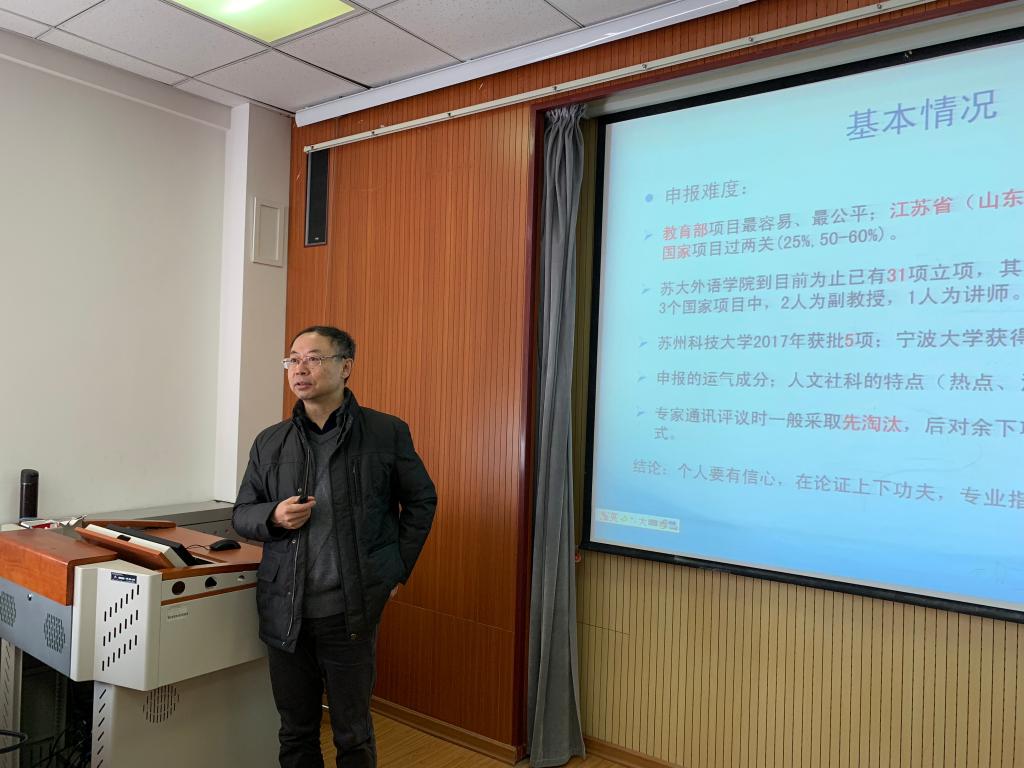 12月14日下午13时30分,苏州大学beat365英国官方网站副院长、教授、博士生导师、Language and Semiotic Studies(《语言与符号学研究》)全英文国际期刊主编王军教授应邀来我院进行学术交流,为大家讲解如何申报国家社科基金项目及一般科研方法。此次学术报告在经管楼505室举办,由beat365英国官方网站院长尹洪山主持,学院党总支书记张洪坤、副院长吕耀中及部分科研骨干和青年教师80余人参加了本次讲座与交流。