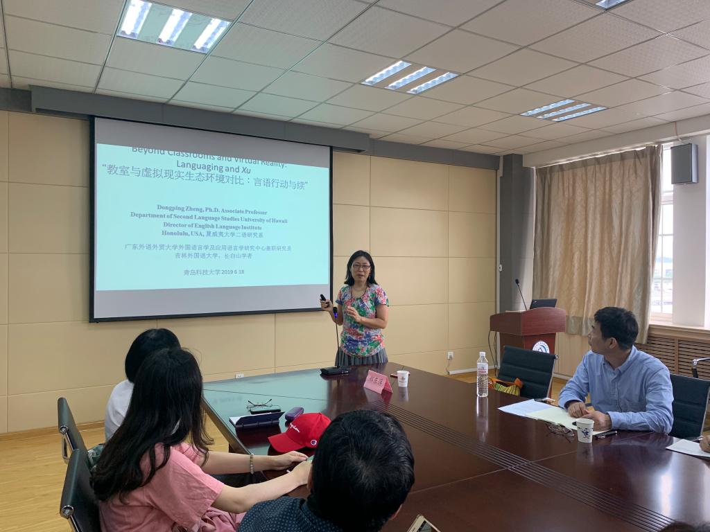 6月18日下午,美国夏威夷大学二语研究系教授,博士生导师郑东萍应我院邀请,在外语楼517会议室做了题为《教室与虚拟现实生态环境对比:言语行动与续》的报告。报告会由院长尹洪山教授主持,院长助理刘靖及部分教师和研究生参加了报告会。