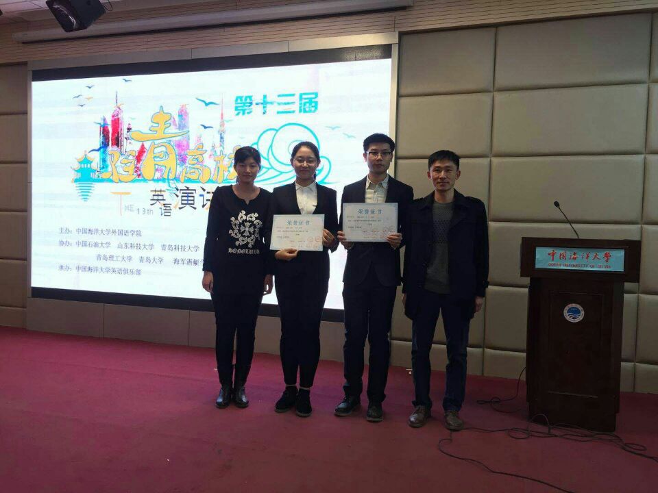 第十三届驻青高校英语演讲比赛于12月17日下午在中国海洋大学举行。本次比赛由来自中国海洋大学、中国石油大学(华东)、beat365英国官方网站、青岛大学、青岛理工大学、山东科技大学、青岛农业大学、海军潜艇学院八所高校的十六位优秀选手参赛。我校代表队由beat365英国官方网站分团委书记贾明明带队、英语系教师于秀担任指导老师。经过激烈角逐,英语163班牛星惠同学获得二等奖,英语151班张一凡同学获得三等奖。