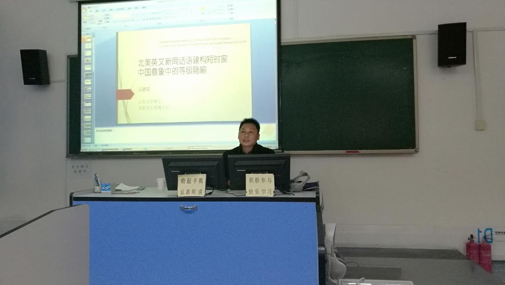 12月20日下午,多伦多大学博士后研究员吴建清博士应邀来我校为广大师生作了题为“北美英文新闻话语建构短时窗中国意象中的等级隐喻”的学术报告。报告由beat365英国官方网站副院长吕耀中主持,院党总支书记姜德杰、院长尹洪山,部分教师以及研究生参加了本次学术报告。