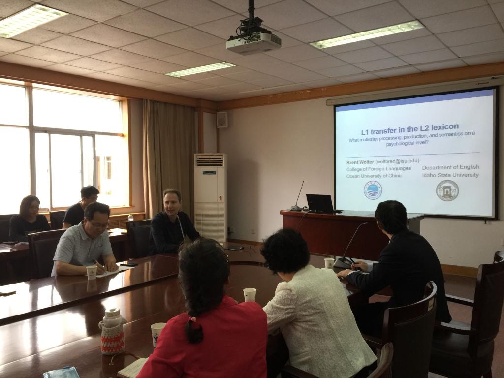 5月29日日下午,美国爱达荷州立大学教授Brent Wolter应外语学院邀请在经管楼313室作了题为《搭配使用中的哪些方面促成心理学层面的二语加工和产出?》的报告。报告会由尹洪山院长主持,副院长任素贞、吕耀中、院长助理刘靖及部分教师和研究生参加了报告会。