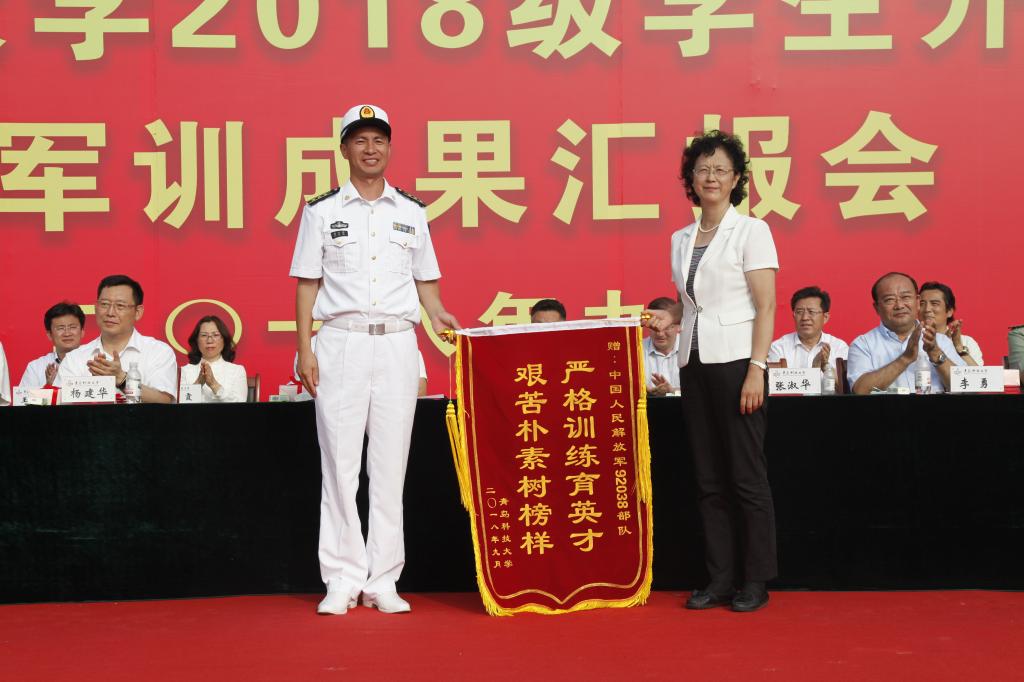 党委副书记张元利、副校长张淑华代表学校向92038部队赠送锦旗,副校长李勇在典礼上宣读了《beat365英国官方网站关于表彰2018级学生军训先进集体和优秀教官的决定》《beat365英国官方网站关于颁发2018年优秀新生奖学金的决定》。获奖的军训先进营、内务先进营、军训先进连、优秀教官代表,以及优秀政治教导员上台领奖。53名新生领取了新生奖学金,其中普通本科生29人每人奖励5000元,中德合作办学项目23人每人奖励30000元、中法合作办学项目1人奖励20000元。