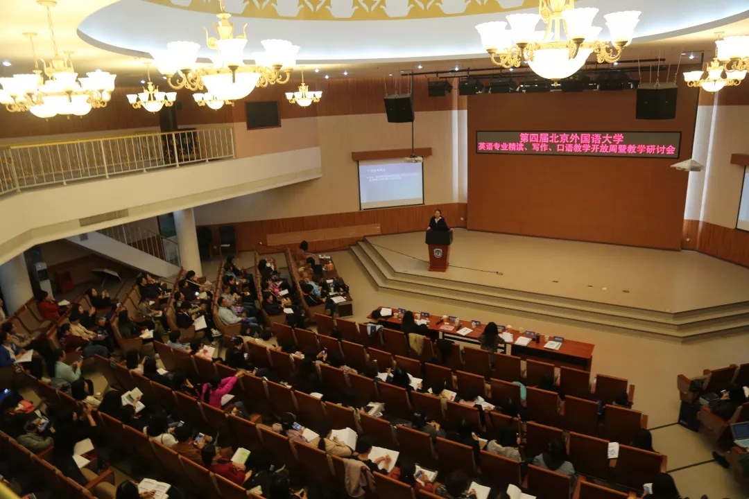 此次开放周暨研讨会以交流融合语言与知识学习,以能力为导向的英语专业改革经验,探讨重视语言能力、跨文化能力与思辨能力培养的教学实践成果和研究动态为目的,由北京外国语大学英语学院、教务处、教师发展中心,北京地区高校英语类专业群和外语教学与研究出版社联合举办。来自全国80余所高校的近200名教师参加了本次开放课堂暨教学研讨会,通过主旨报告、开放课堂、教学研讨、说课评课、集体备课及教学展示等多个环节,就《国标》指导下的英语专业基础阶段技能课程改革与教学研究作了深入研讨。