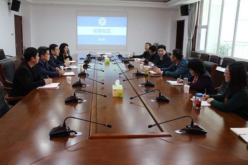 4月6日上午,beat365英国官方网站院长尹洪山、党总支书记姜德杰等一行8人到高密校区考察调研,并与高密校区领导梁树清、官杰及相关部门负责人进行了座谈交流。