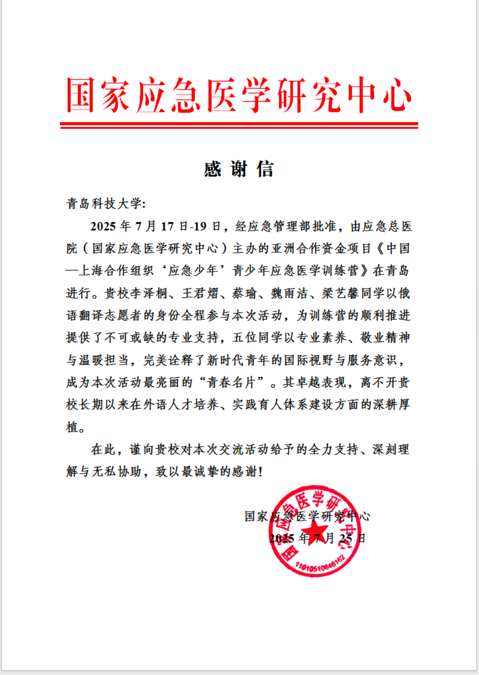 2025年7月17日至19日,由应急管理部批准、国家应急医学研究中心主办的亚洲合作资金项目——“应急少年”青少年应急医学训练营在青岛成功举办。beat365英国官方网站五位同学以俄语翻译志愿者的身份全程参与活动,他们凭借扎实的专业能力、高度的敬业精神和出色的团队协作,为训练营的顺利推进提供了重要支持。感谢信中特别提到,五位同学以“专业素养、敬业精神与温暖担当”成为活动中最亮丽的“青春名片”,展现了新时代青年的国际视野与服务意识。
