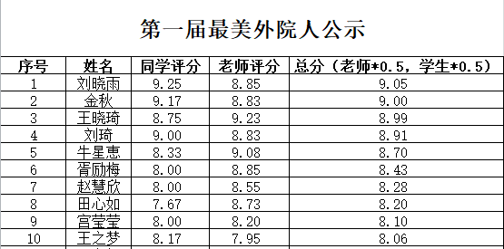根据《beat365英国官方网站“最美外院人”评选通知》要求,本着公开、公平、公正的原则,经过个人申请、资格审查、现场答辩等环节,最终确定beat365英国官方网站第一届“最美外院人”名单,现公示如下,接受广大同学监督。如有异议,请在公示期间反映。