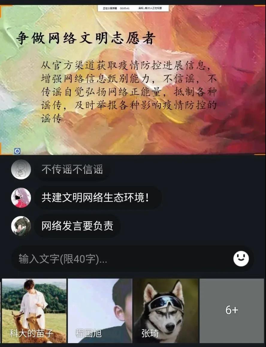 beat365英国官方网站各个班级通过群视频的方式举办了“争做网络文明志愿者”主题教育线上活动。活动主讲人为同学们讲解了网络文明维护各个方面的知识,学习了有关网络宣传管理的有关规定,并结合本次疫情开展了“谣言粉碎机”专栏。主讲人通过辟谣的方式向同学们宣传网络文明,最后发起倡议,争做网络文明志愿者,不信谣,不传谣,自觉弘扬正能量。在此次活动中,同学们认真听讲,同时也激发了他们争做网络文明志愿者的热情,推动了班级队伍的建设,为校园文化发展贡献一份力量。