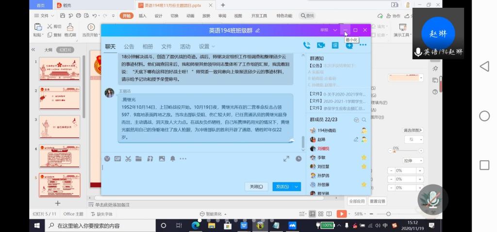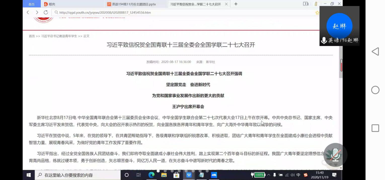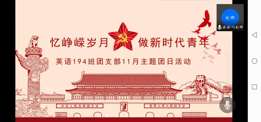 11月19日下午,beat365英国官方网站英语194团支部依托线上平台举行了“忆峥嵘岁月,做新时代青年”主题团日活动。团支部全体团员参与,团日活动由团支部书记主持。