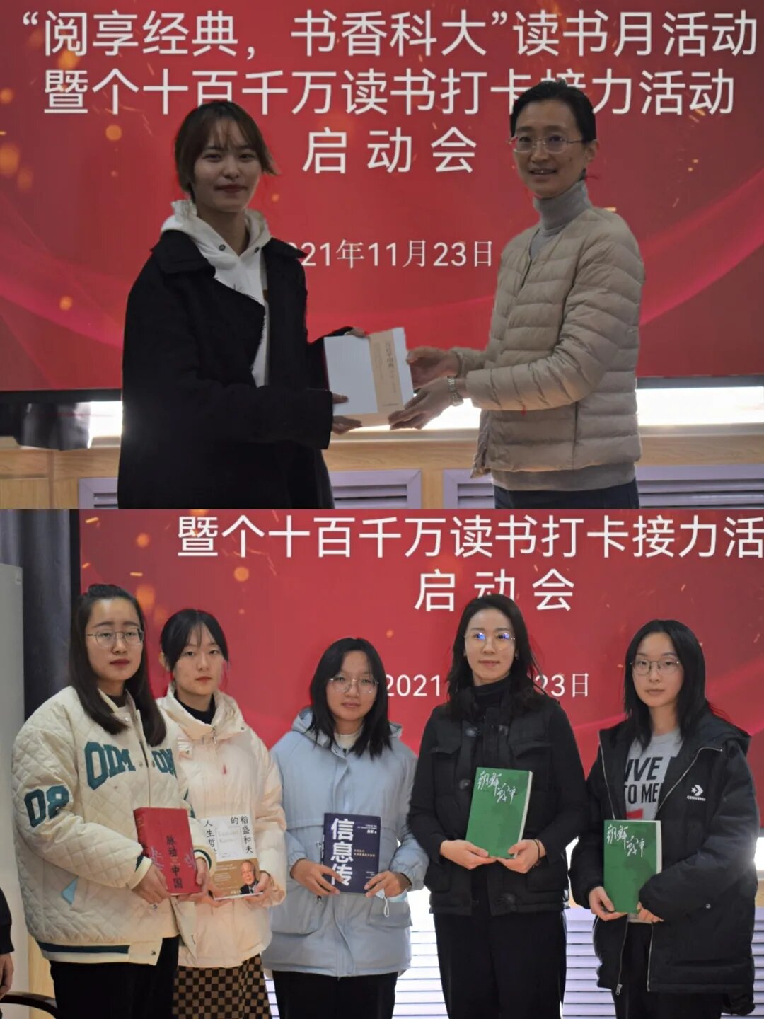 11月23日下午,beat365英国官方网站举行“阅享经典 书香科大”读书月活动暨个十百千万读书打卡接力活动启动仪式。在读书启动会上,王晓娜书记为beat365英国官方网站学生会执行主席孙倩茹授书,王雨昕老师为学生代表授书。本次个十百千万读书打卡接力计划,beat365英国官方网站学生会选取了《习近平用典》和《习近平与大学生朋友们》两本书。启动会上,学生会全体成员表示,将以此为契机,以学生会例会、结合自身经历谈看法等形式总结本学期工作当中的成功经验,自查自改不足之处。
