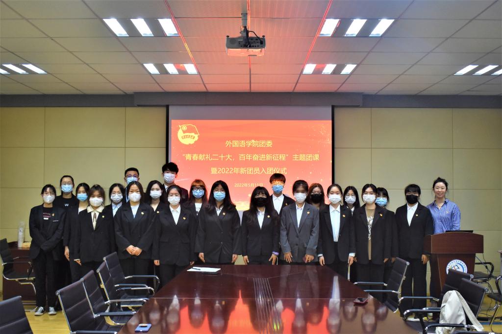 在庄严的国歌声中,2022年新团员入团仪式正式开始。王雨昕老师主持此次仪式并宣布新团员名单。张湘钧老师为韩语191班张明钰、日语202班李悦菡、俄语211李彤、韩语211唐佳璇、日语211周子怡五位新团员佩戴团徽。随后,新团员集体宣誓,从佩戴上团徽的这一刻起,新团员们铭记自己肩负的责任,努力履行团员的义务,用实际行动来表明自己无悔”共青团员“这个光荣的称号。张湘钧老师领学《中国共产主义青年团章程》团员义务和权利,新团员表示会积极履行团员义务,在活动中起模范作用。接下来,韩语191班张名钰同学代表新团员发言,她代表全体新团员作出承诺:发扬共青团的优良传统,以团员的标准严格要求自己,用热情谱写辉煌。韩语211时心仪同学作为老团员代表发言,她向团员们发出三点倡议,呼吁团员们珍惜青春年华,崇尚科学,追求真知,为团徽增辉,为团旗增色,为实现共产主义事业而奋斗。伴随着全场齐唱共青团团歌,本次主题团课暨入团仪式顺利落下帷幕。