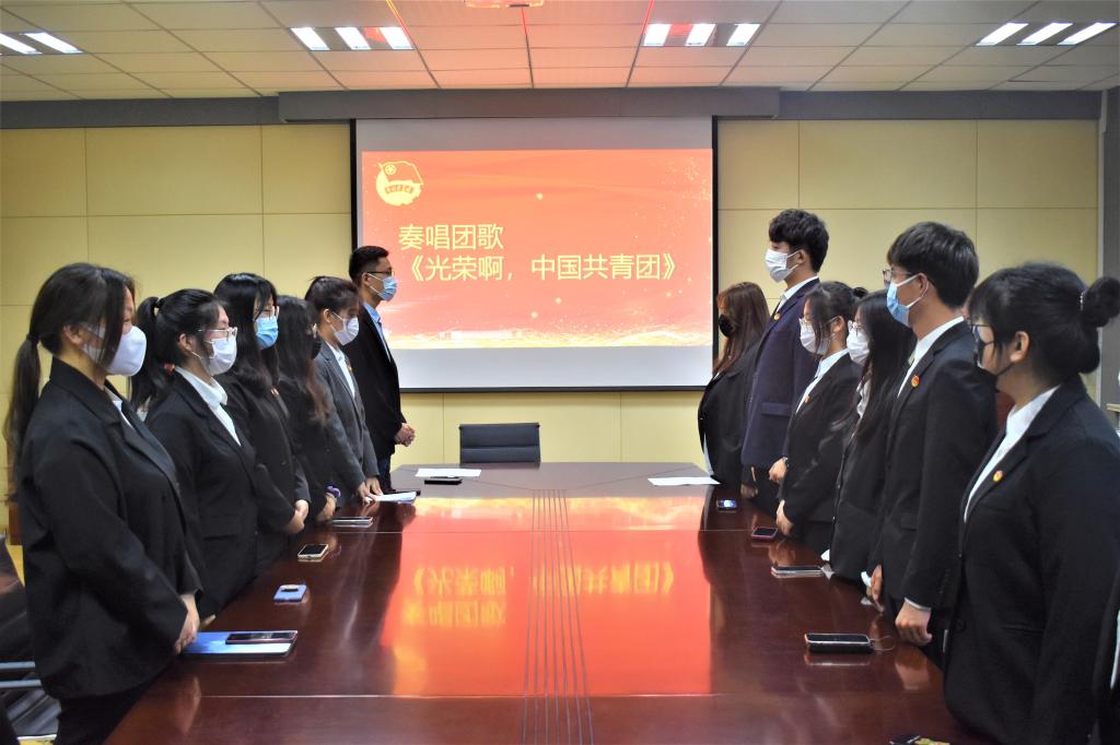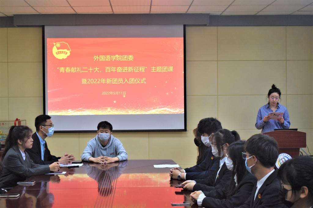 为进一步弘扬五四精神,增强“听党话、感党恩、跟党走”的思想觉悟和行为自觉,庆祝建团100周年,5月11日18:00,beat365英国官方网站“青春献礼二十大,百年奋进新征程“主题团课暨2022年新团员入团仪式在外院楼517隆重举行。出席本次活动的有beat365英国官方网站团委副书记兼学工办副主任李东阳老师、王雨昕老师和团委老师张湘钧,五位新团员以及2021级全体班长、团支书。
