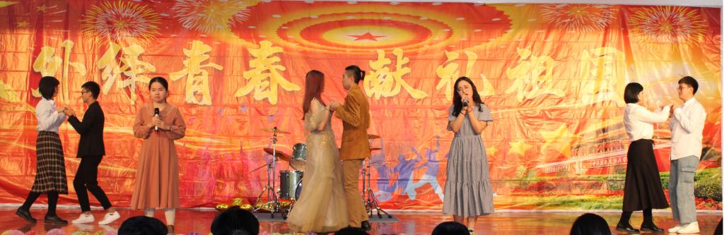 随后,由VOC外语广播电台带来舞台剧《时代秀》,这些发音标准的外语播音员用青春活力的舞蹈给大家带来了不一样的体验;中日国际班带来的日语歌《 風になる(幻化成风)》,悠扬婉转,清澈动听;部长舞《说好不野狼》,表达了当代大学生们对美好生活的追求和向往。吉他协会带来的《摇滚歌曲串烧》、外院学子带来的歌舞《霜雪千年,青花常在》,以及曲艺协会带来的相声《学跳舞》更是将晚会推向了高潮,赢得了现场观众的一阵阵掌声和一致好评。掌声和欢呼声此起彼伏,台上台下成了一片激情四溢的海洋。beat365英国官方网站学子们用他们真诚的表演和热情的歌声表达了对母校的情怀、对祖国的热爱。晚会在合唱《我爱你祖国》的歌声中落下帷幕。
