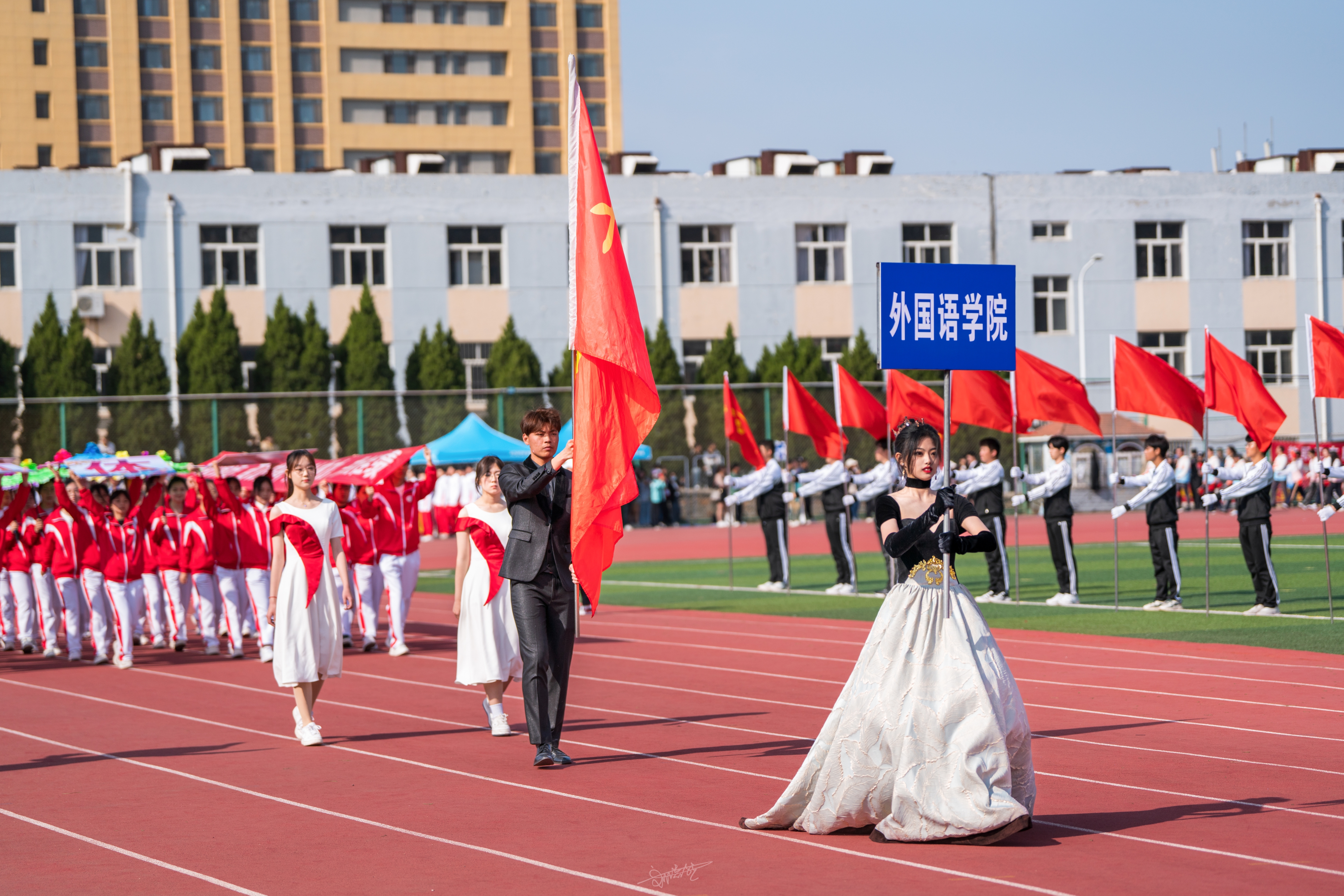 上午8:00,开幕式正式开始。伴着音乐声和介绍词,外院方阵队伍整齐划一,昂首走来,彰显了外院学子自信自强、蓬勃向上的精神面貌。在随后的排舞汇演中,外院学子用整齐划一、训练有素的舞姿,展现出外院人的积极进取,昂扬向上的青春风貌。