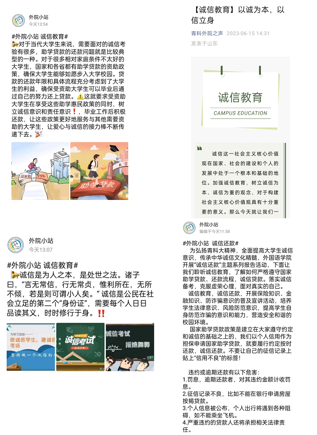 beat365英国官方网站注重宣传教育,在微信和QQ公众平台上相继推出“诚信还款”“预防金融诈骗”“诚信考试”等内容,及时推送相关主题活动和动态。通过宣传的力量,让同学们充分认识开展高校学生资助诚信教育主题活动的意义,提高学生诚信意识和责任意识,营造“人人知诚信,人人讲诚信”的良好氛围。