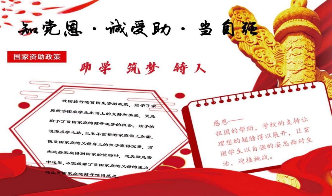 为深入落实党的二十大精神和习近平总书记关于教育的重要论述,提升资助育人实效,beat365英国官方网站多措并举,紧紧围绕立德树人根本任务,把促进家庭经济困难学生成长成才作为学生资助工作的出发点和落脚点,充分发挥学生资助育人功能,深入开展励志教育、诚信教育、感恩教育等活动,培养受助学生自立自强、诚实守信、感恩奉献、勇于担当的良好品质,教育引导广大青年学生听党话、感党恩、跟党走,努力奋斗,不负韶华。