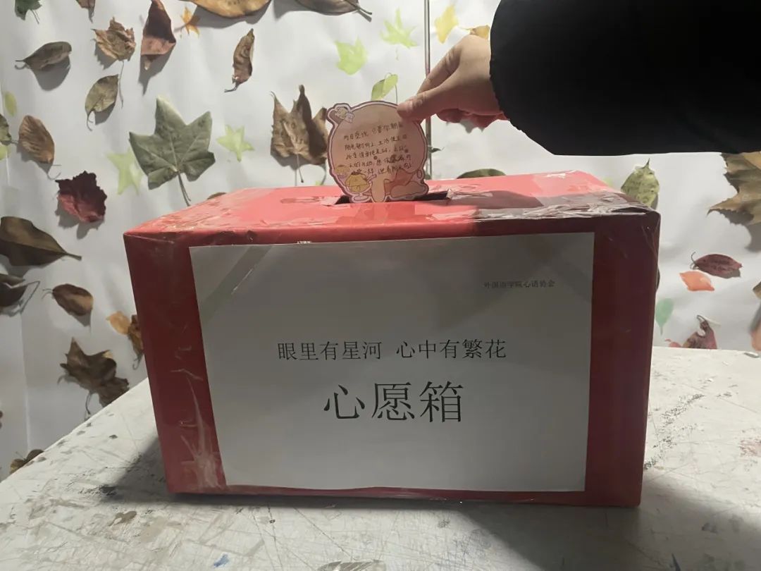 心语协会组织各班心理委员收集同学们的便利贴,汇总后放置于外院楼下心愿箱中组织大家随机抽取。若抽到了烦恼就予以解答,若抽到了暖心话语就分享感动。每一张心愿便利贴不仅承载着同学们近期的情绪表达,还寄语着温暖祝福。