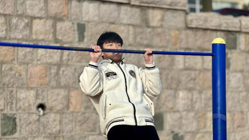 单杠之上,敢讲青春。蓝天指引着方向,烈日热映着热情。寒冷的天气浇不灭同学们的激情,在一阵阵呐喊中,引体向上比赛火热进行。